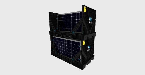 PVpallets are made from waste paper HDPE plastic with steel-reinforced floor and plastic side walls to protect the solar modules during transport. The outer walls can be adapted to different module sizes. In addition, walls fold down and pallets stack to facilitate return shipping and maximize storage space. PVpallets enable improved efficiency and waste reduction throughout the solar supply chain, including manufacturing, distribution, installation, decommissioning and recycling, warehousing and construction waste disposal.